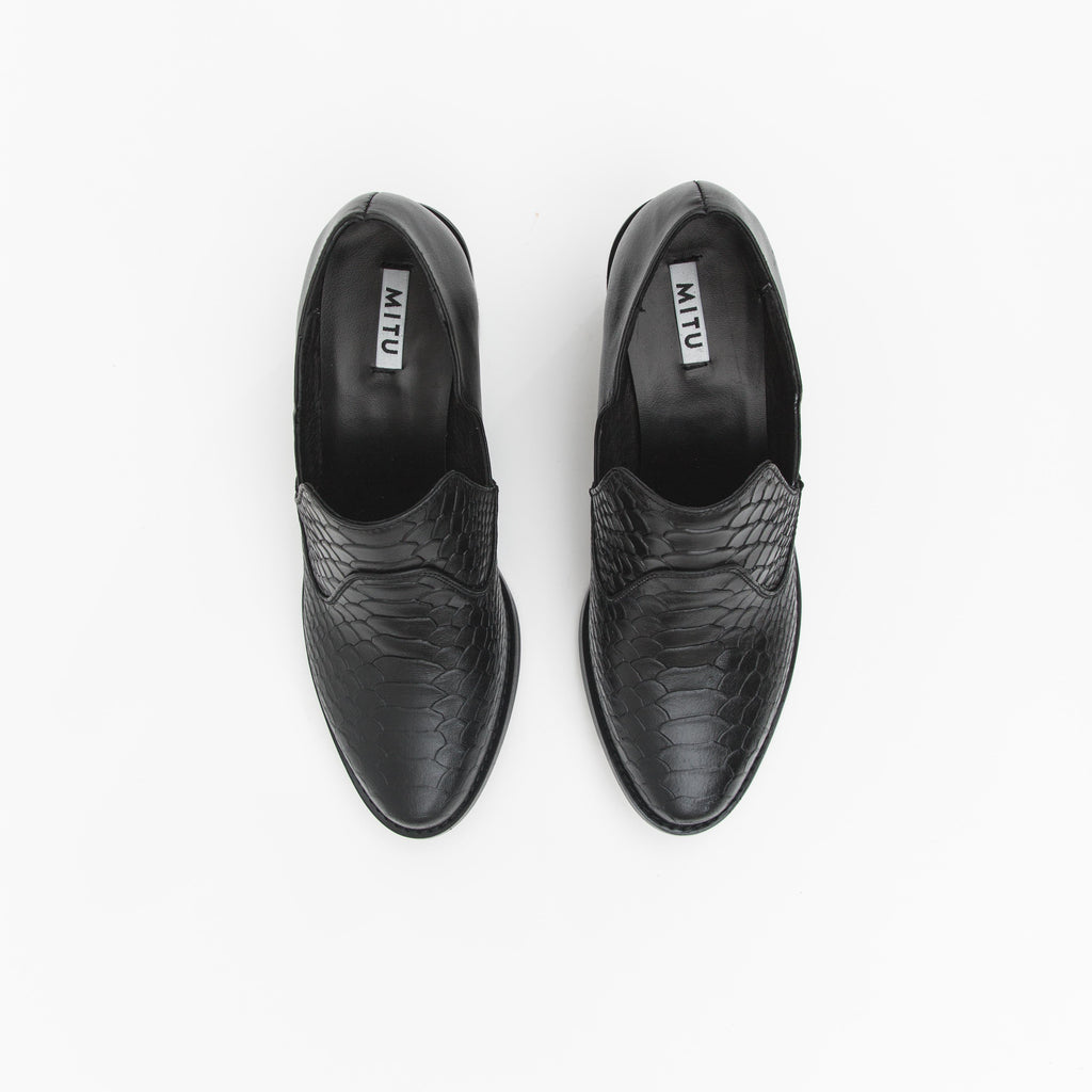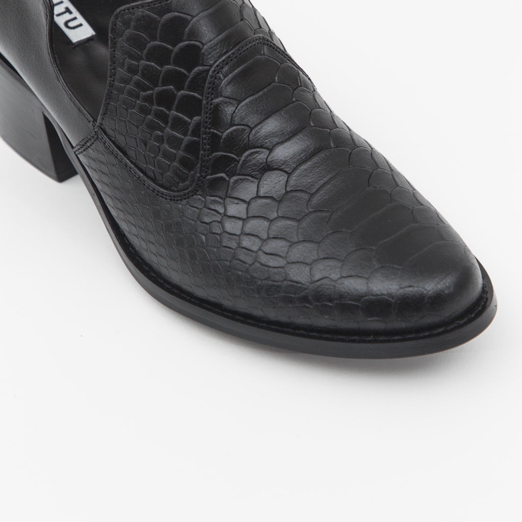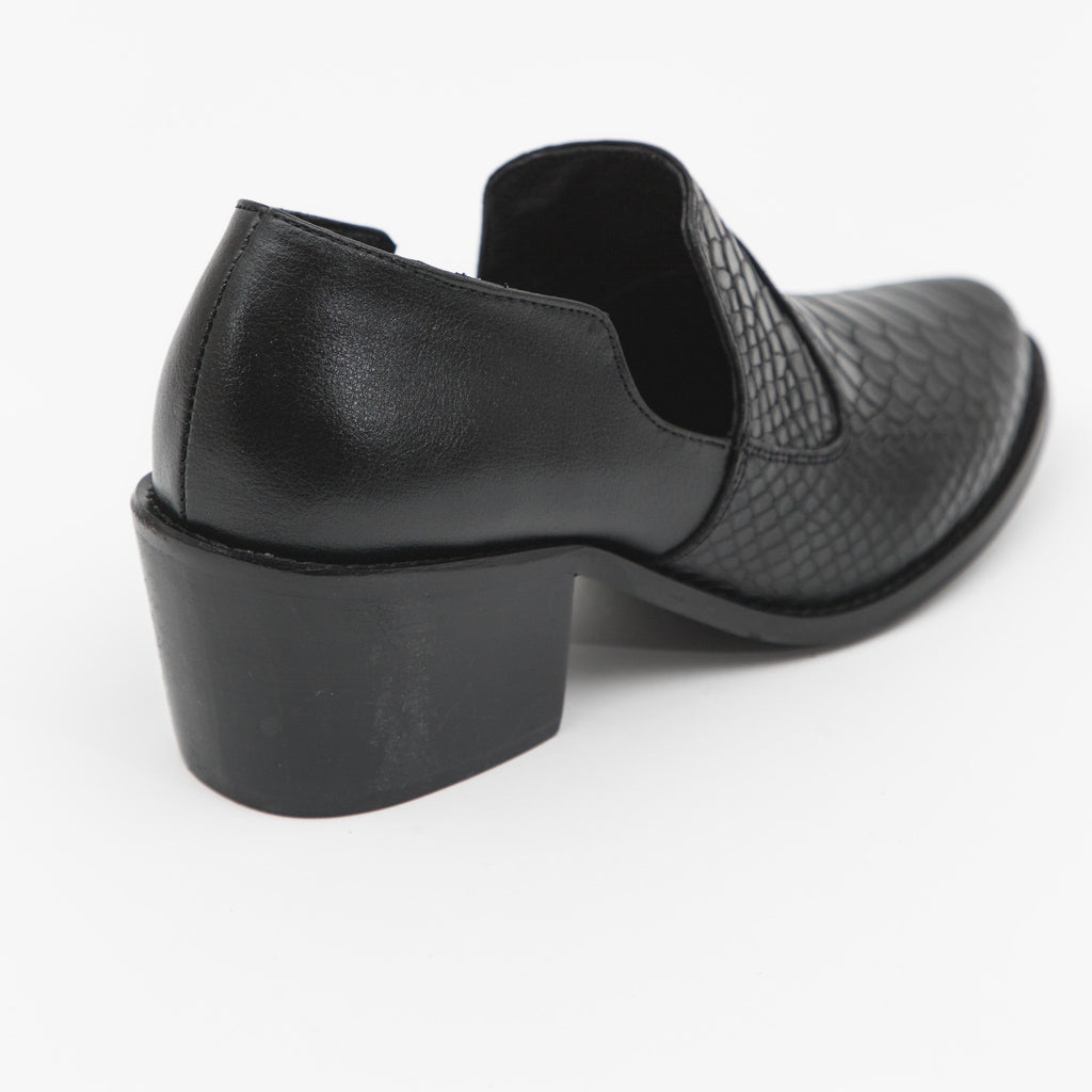 Zapatos negros de piel mujer. Esta edición de Julia tiene un grabado en la piel estilo cocodrilo en la parte frontal. Un modelo único y elegante.