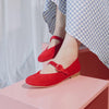 Mary Janes de terciopelo color rojo con punta redonda. Suavecitas por fuera y por dentro, atemporales y muy versátiles.